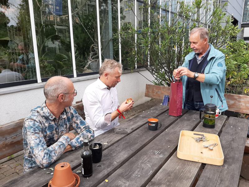 Danach hatten die angehenden Studierenden mit Mitarbeitern im Freien einen Imbiss mit Hot-Dogs vorbereitet. In gemütlicher Atmosphäre vor dem Schaugarten mit biogenen Pflanzen haben wir mit Prof. Stollberg den Erfahrungsaustausch fortgesetzt und ihn über die vielfältigen Aktivitäten des VDI Hallescher BV informiert.